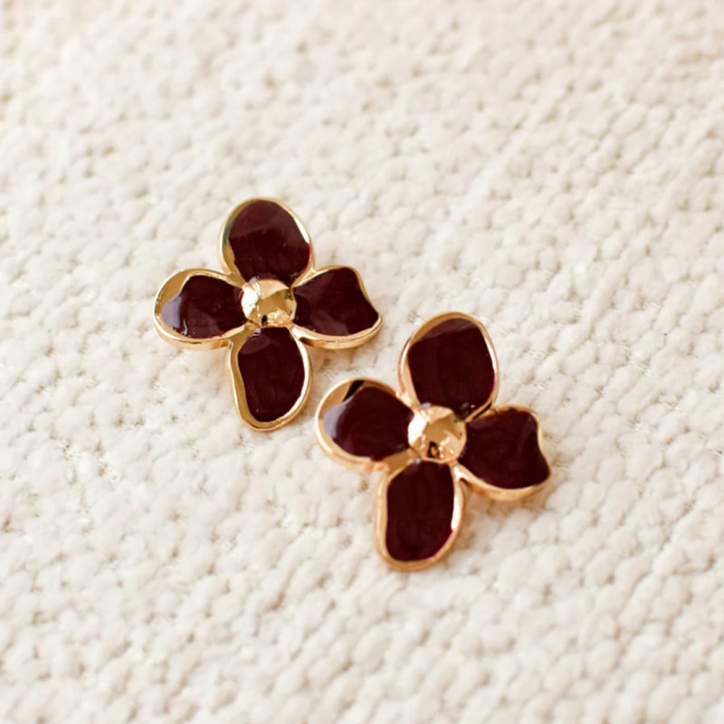 Les boucles d'oreilles Latica bordeaux mesurent environ 2,9 cm et forment une fleur à quatre pétales émaillés bordeaux dans un contour doré en acier inoxydable. Le duo bordeaux-or crée une harmonie sophistiquée qui traverse les saisons sans jamais se démoder.