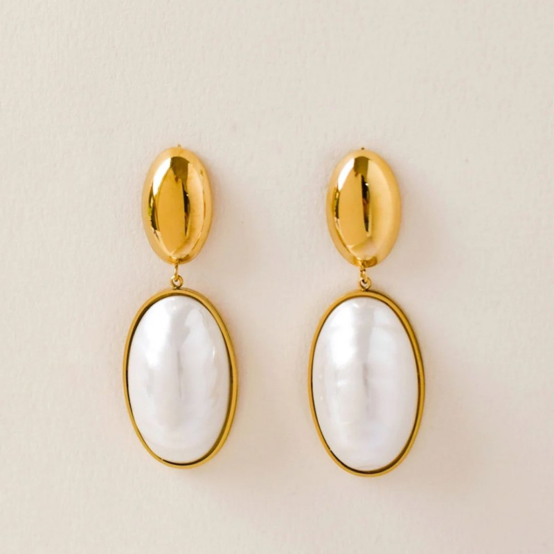 Avec une hauteur de 6 cm, ces boucles d'oreilles encadrent le visage avec grâce. La perle nacrée capte la lumière et apporte une douceur qui contraste joliment avec l'éclat doré de l'acier.