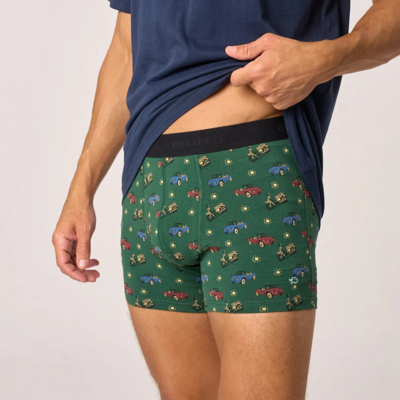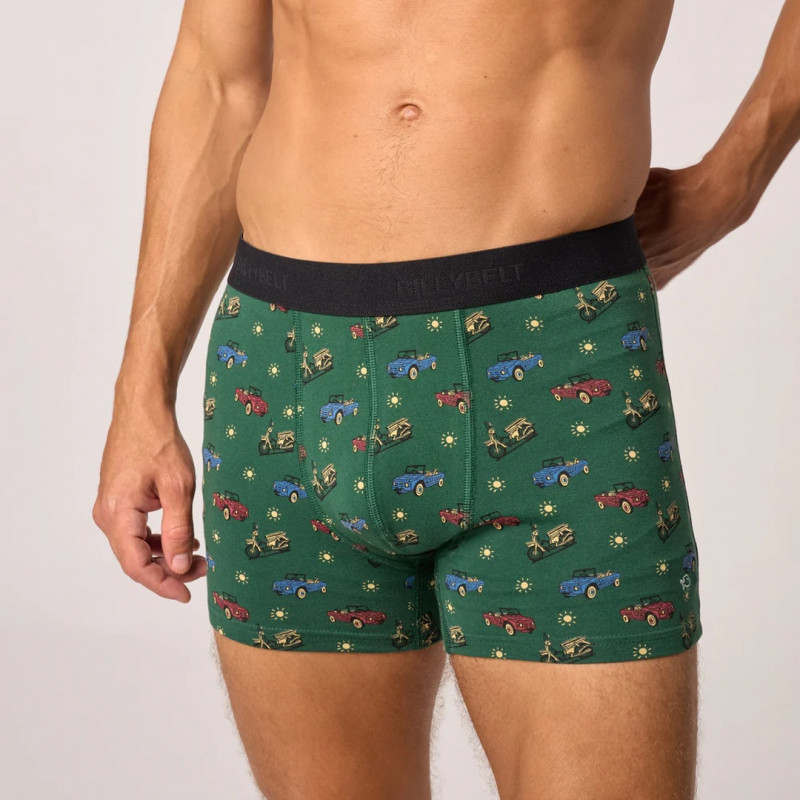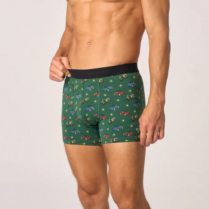 Prenez le volant du style avec ce boxer roadtrip Billybelt en coton bio 100% certifié GOTS décoré de voitures vintage colorées sur fond vert. Une pièce qui célèbre l'élégance automobile des années 50-60 avec un twist contemporain.