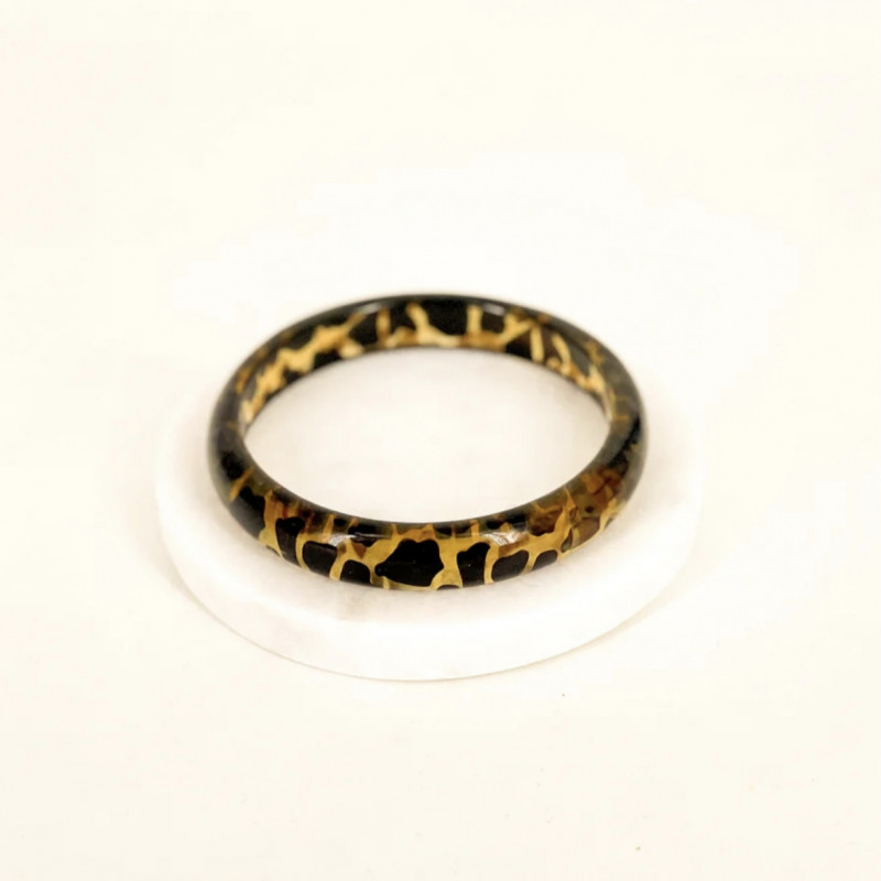Le jonc Léo Fin mesure 65 mm de diamètre intérieur avec une épaisseur de 8 mm seulement. La résine lisse glisse facilement sur le poignet et ne pèse rien, ce qui permet de l'oublier tout en profitant de son impact visuel.