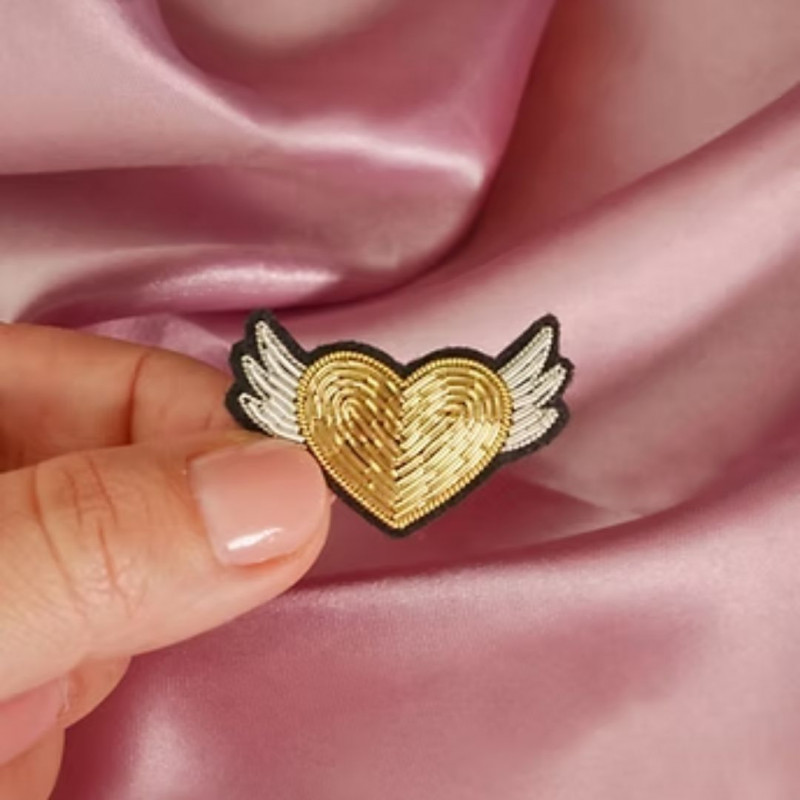La broche Malicieuse Cœur Ailé, c'est ce petit bijou de 3,5 x 2,5 cm entièrement brodé en cannetille. Son motif représente un cœur doré avec deux ailes d'ange. C'est le détail qui attire l'œil sans crier, et qui raconte une histoire à celles qui savent regarder.