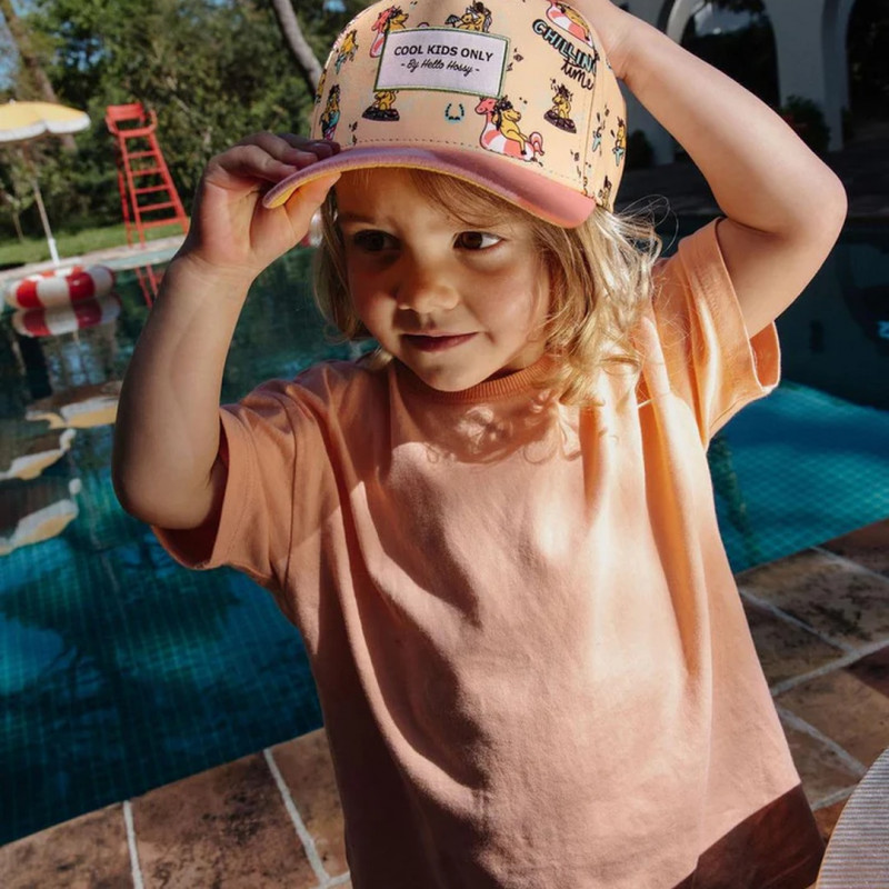 Les teintes pastel s'accordent facilement avec toutes les garde-robes enfantines. La visière courbée protège efficacement du soleil tandis que l'attache réglable garantit un confort optimal qui évolue avec la croissance.