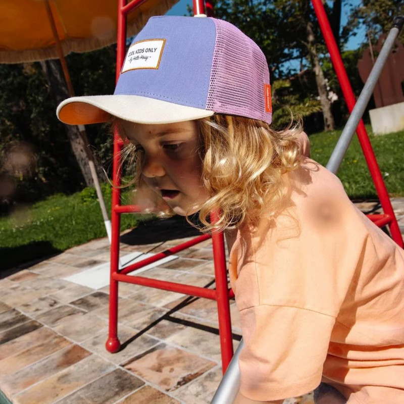 Sa teinte violette subtile évoque les fleurs d'iris, ni trop girly, ni trop neutre : un équilibre parfait qui convient aussi bien aux filles qu'aux garçons. La visière courbée offre une protection solaire efficace tandis que l'attache réglable garantit un confort optimal qui évolue avec la croissance.
