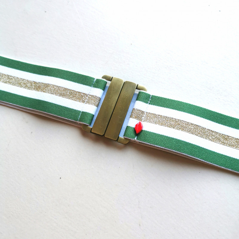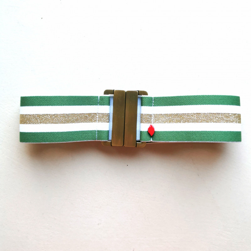 Oubliez les accessoires fades ! La ceinture Emilia joue la carte du show avec son mélange audacieux de lurex vert et doré. Une touche brillante qui fait sourire et attire les regards à chaque pas.