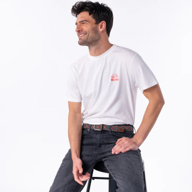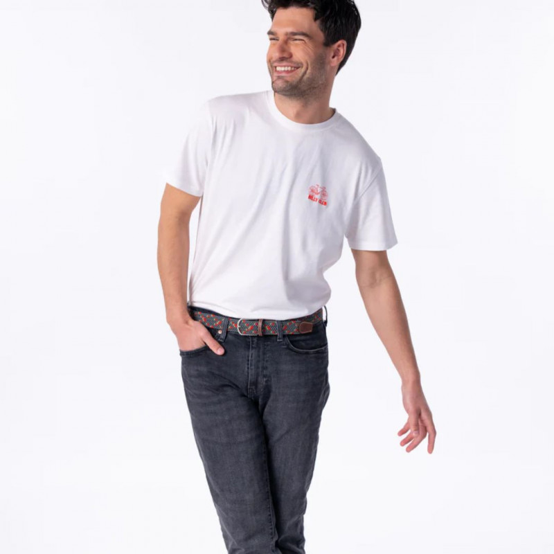 La ceinture Billybelt Goteborg mesure 3,2 cm de largeur et tresse ensemble le gris chiné, le rouge brique et le vert sapin dans un motif qui évoque les pulls nordiques et les cabanes en forêt.
