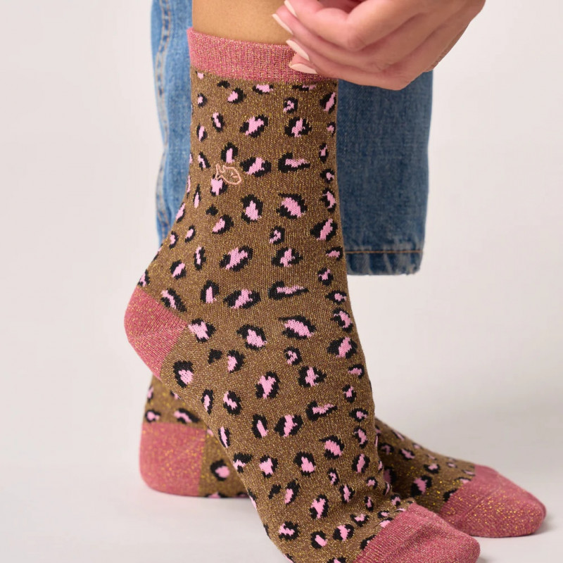 Chaussettes léopard pailletées marron et vieux rose - Billybelt