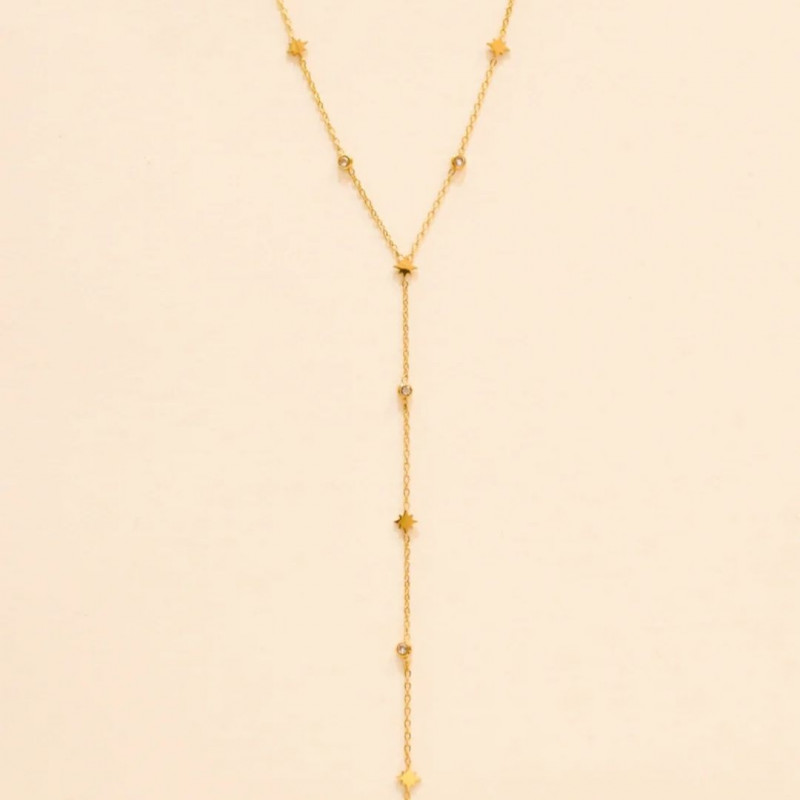 Le collier Stern est un bijou qui marie avec finesse l'acier inoxydable doré et les oxydes de zirconium. Ces pierres captent la lumière et confèrent au collier un éclat subtil qui rappelle celui des bijoux précieux, sans les contraintes d'entretien.