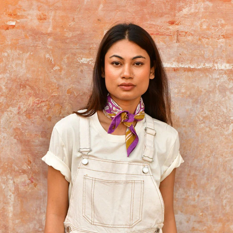 Le carré Byzantine Carthage joue la carte de la couleur : un violet imprimé à la main sur 100 % twill de coton indien.
