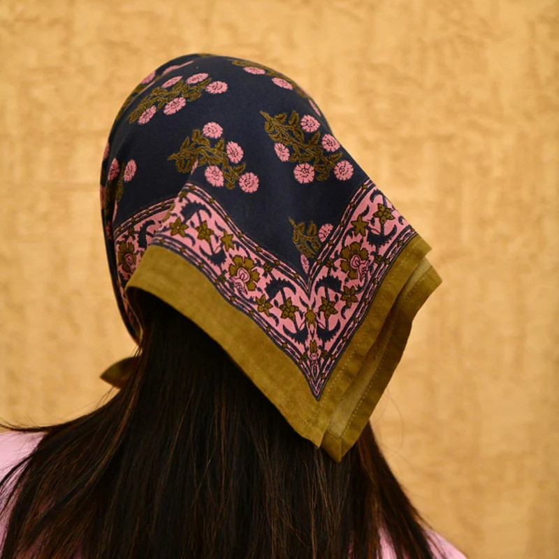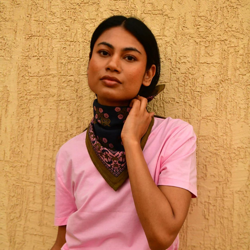 L’impression block-print à la main confère une densité de couleur et de légères variations — chaque pièce est légèrement unique. Porté avec un manteau clair ou un blazer sombre, il donne un supplément d’élégance.