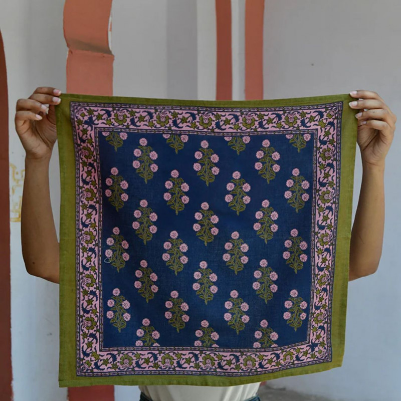 Le carré Antigone de Byzantine offre un bleu nuit profond imprimé sur 100 % twill de coton indien. Le format 50×50 cm en fait le foulard idéal : facile à nouer, discret, facile à porter.