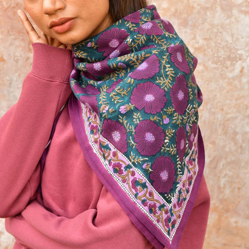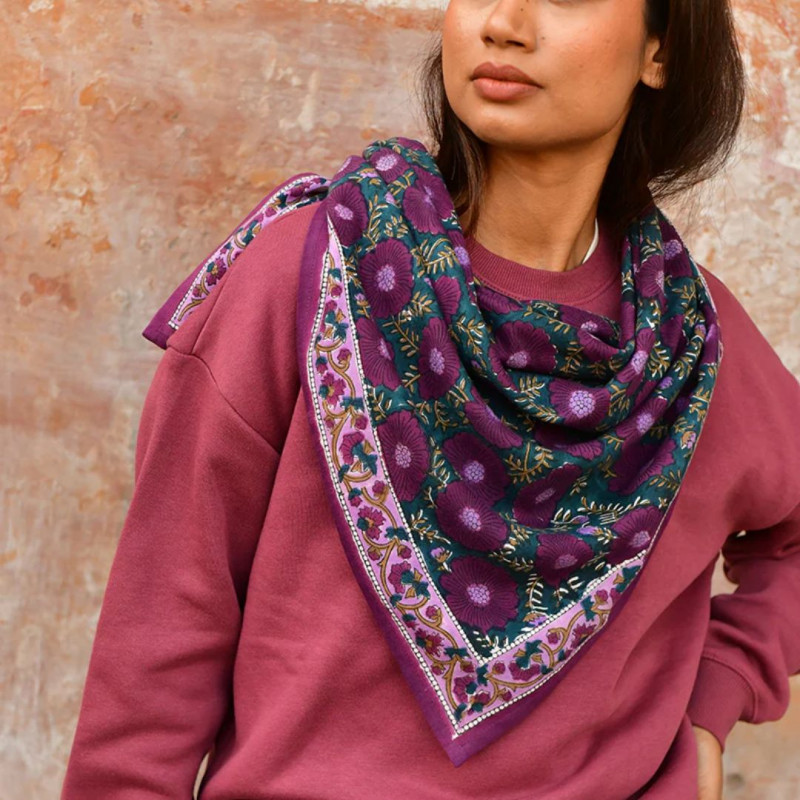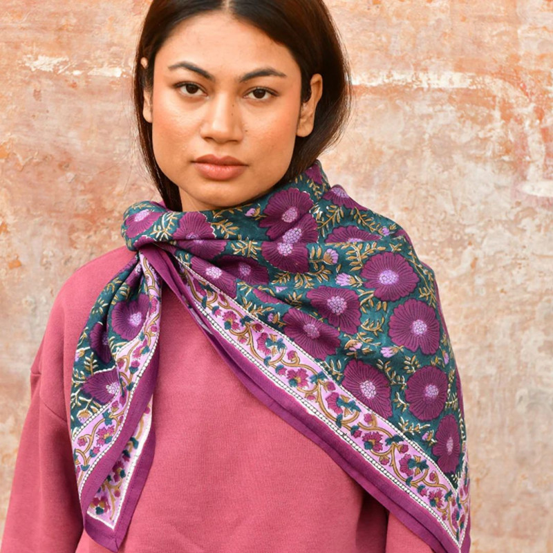 Le Ravenne Prune est un grand foulard 100 × 100 cm qui joue les pièces fortes : vert profond, fleurs et motifs prune confèrent à ce carré une allure intemporelle.