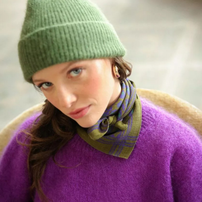 Ce foulard Bellemme est un carré de 70 cm affiche un motif léopard dans des tons vert bronze. En laine, il enveloppe le cou et isole vraiment du froid. Conçu en France et imprimé artisanalement en Inde, chaque pièce porte les légères variations : aucun foulard ne ressemble à son voisin !