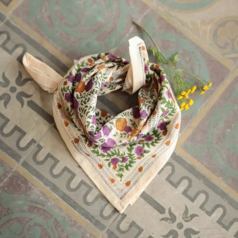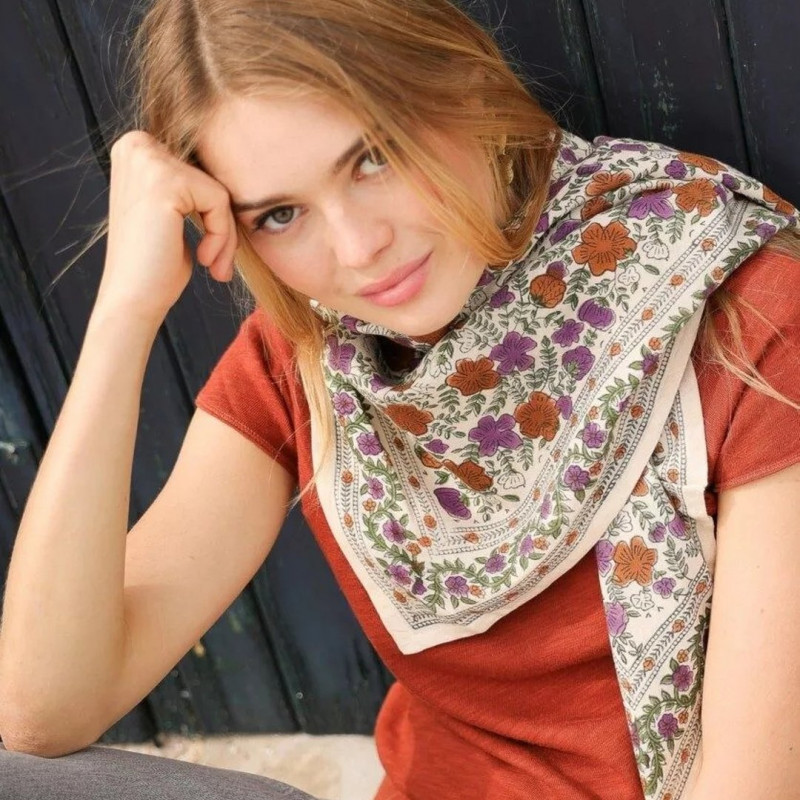 Le foulard Ellis Violette de Bellemme avec son imprimé fleuri, s'impose comme un carré de couleur et de douceur, en 100 % coton, pour s'adapter à tous les styles et toutes les occasions.