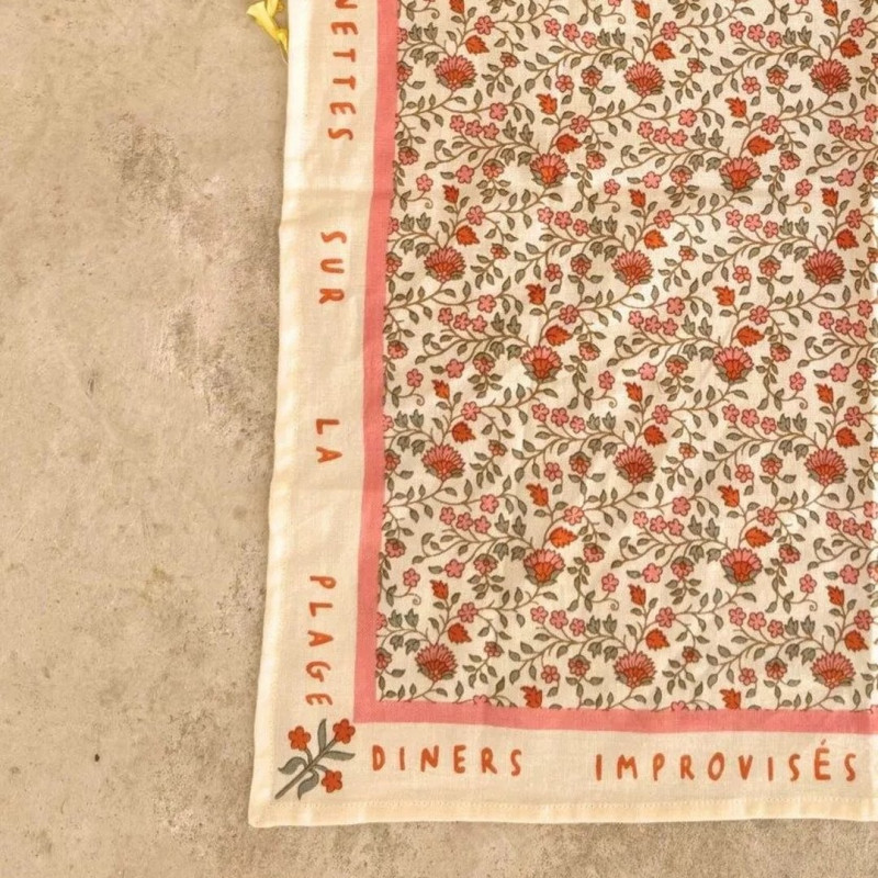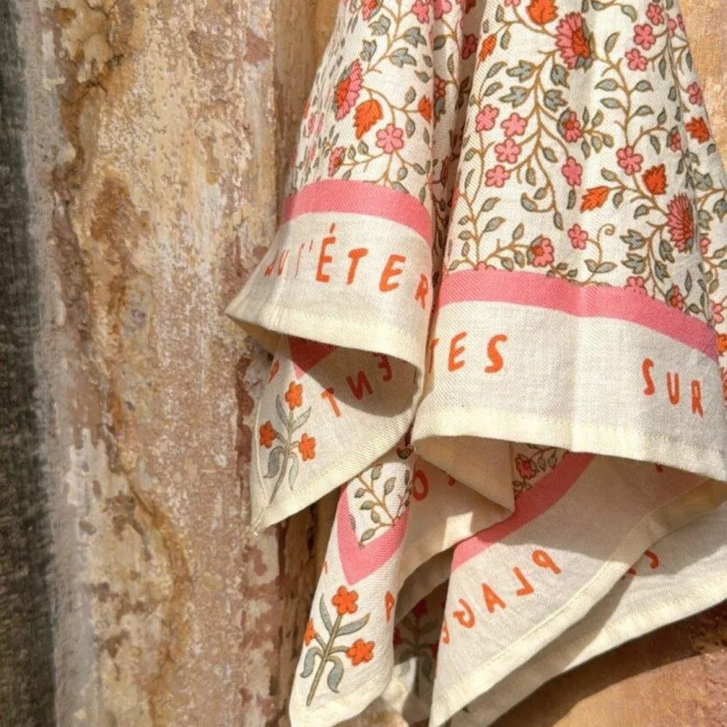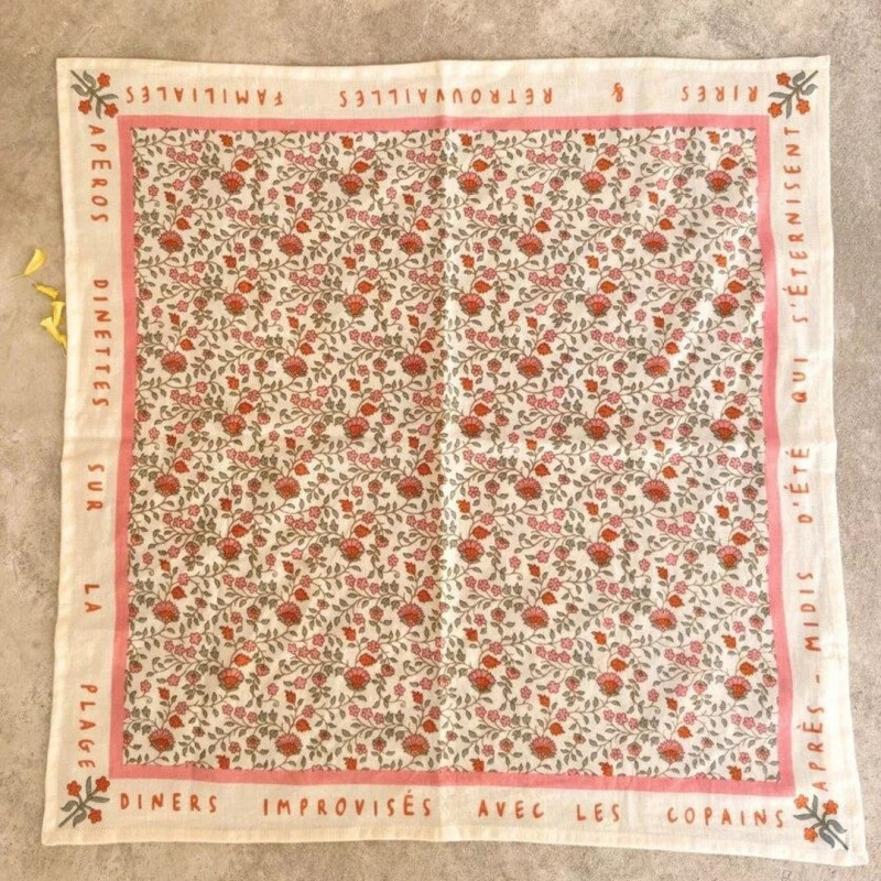 Et si un foulard pouvait raconter quelque chose ? Rosa Sorbet d'Été a choisi de le faire avec des mots : "apéros", "retrouvailles", "dinettes sur la plage"... Ces petites phrases courent en bordure du tissu et font de ce carré bien plus qu'un accessoire. C'est une ode à l'été, glissée dans les plis d'une étoffe rose et orangée.