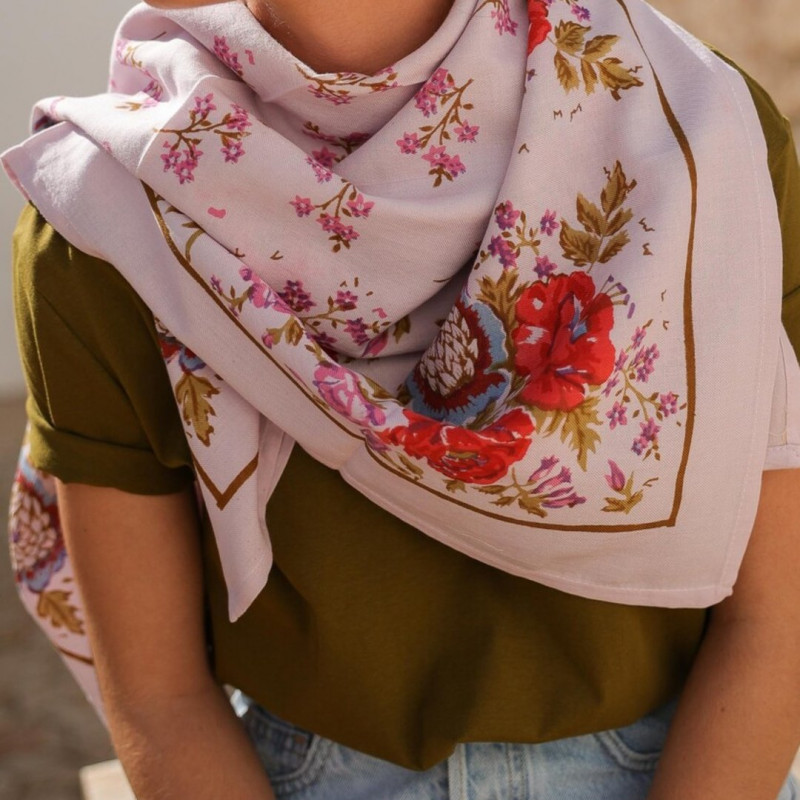 le foulard Jeanet Lilas de Bellemme avec son fond lilas clair, ses motifs floraux et ses arabesques évoquent les foulards qu'on retrouvait dans les tiroirs de nos grands mères.