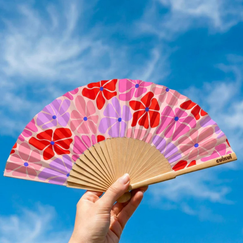 Slowers, comme un souffle sur les fleurs. Cuikui s'est emparé du motif floral pour cet éventail : quelque chose de graphique et contemporain qui garde l'âme florale sans en être prisonnier. Des formes posées avec intention, des couleurs choisies, un résultat qui fait penser à une illustration de magazine indé.