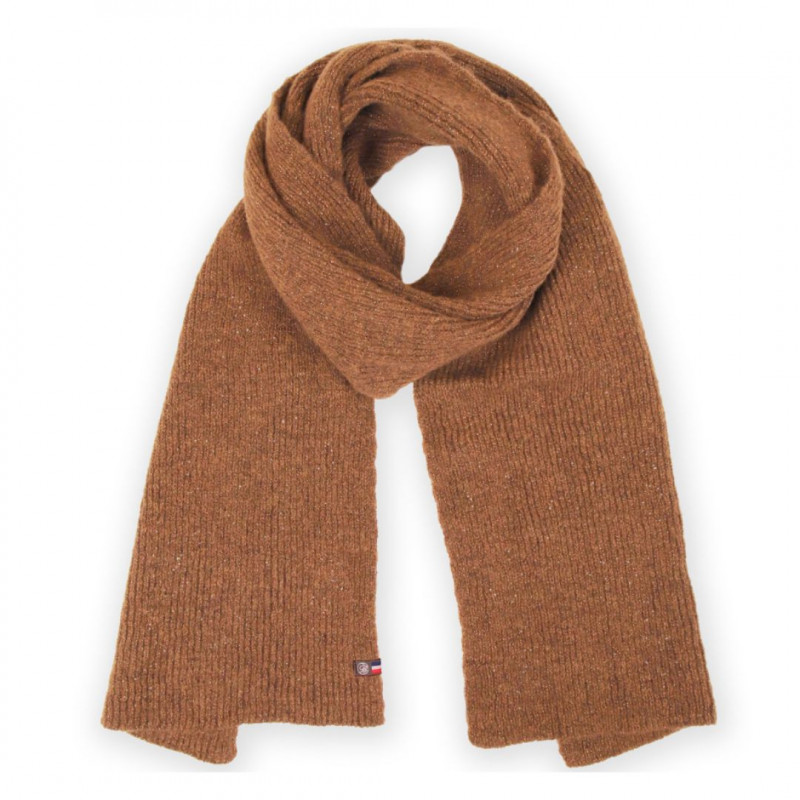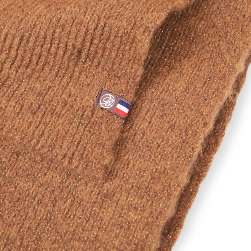 Élégante écharpe femme en laine couleur camel légèrement pailletée de la marque française Maison Bonnefoy.