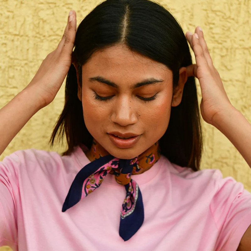 La matière ? 100 % twill de coton indien, très doux au toucher et léger, pensé pour être porté toute l’année. Format compact (50*50 cm), il se noue autour du cou, se glisse dans les cheveux ou s’attache à l'anse d’un sac.