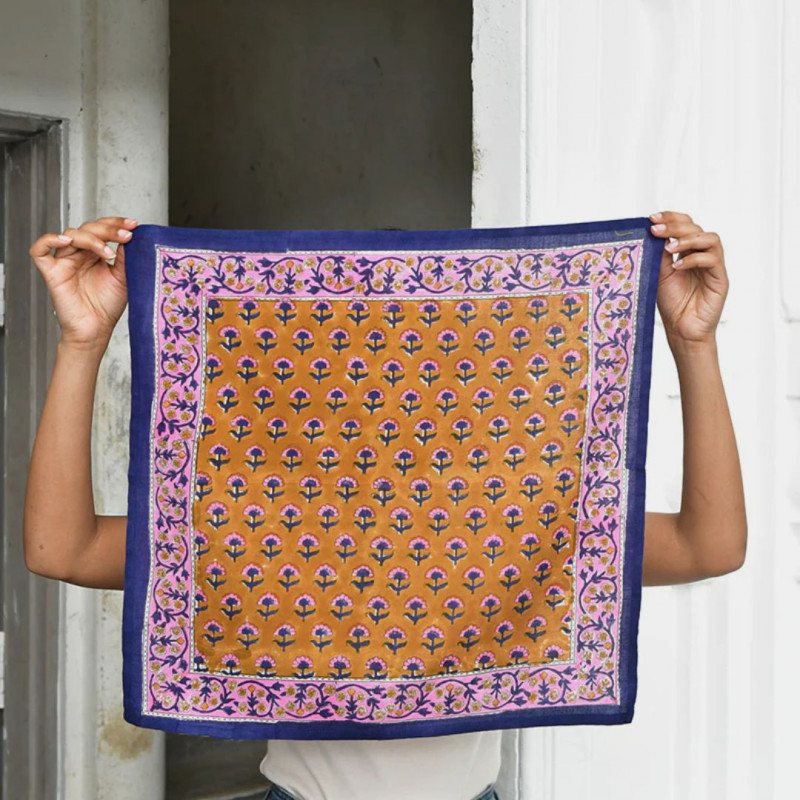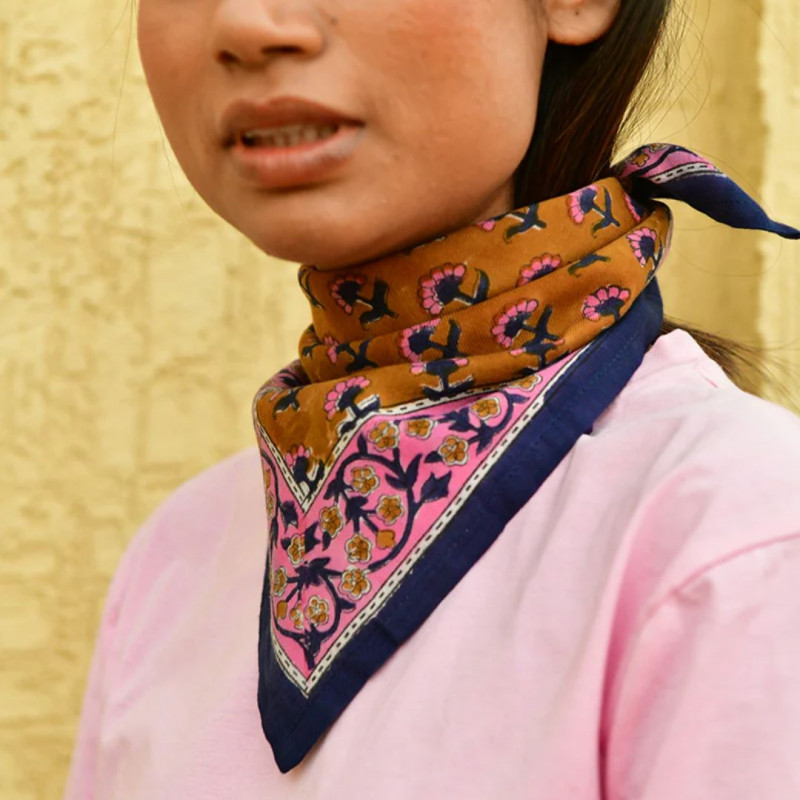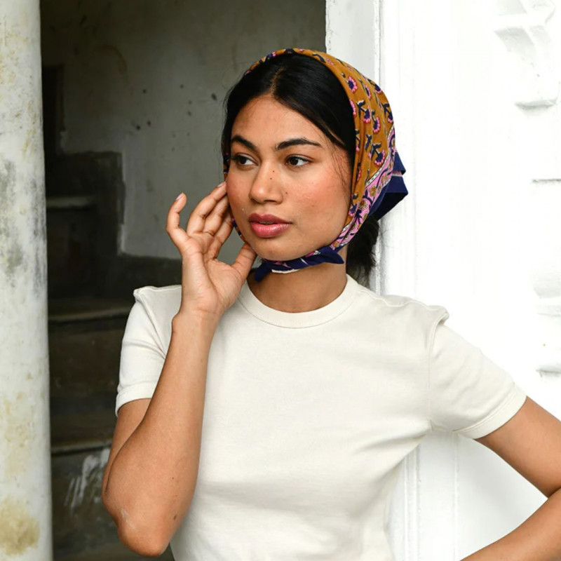 Un petit foulard Byzantine qui apporte une touche bohême au quotidien. Le motif block-print, imprimé à la main au Rajasthan, présente des teintes fauves nuancées qui captent la lumière sans en faire trop.
