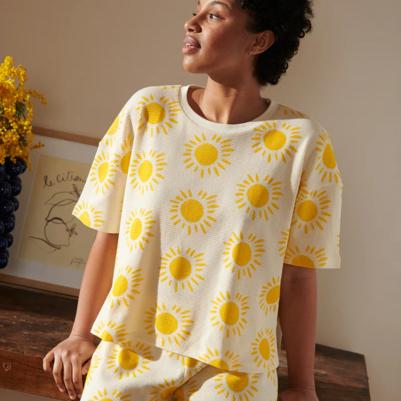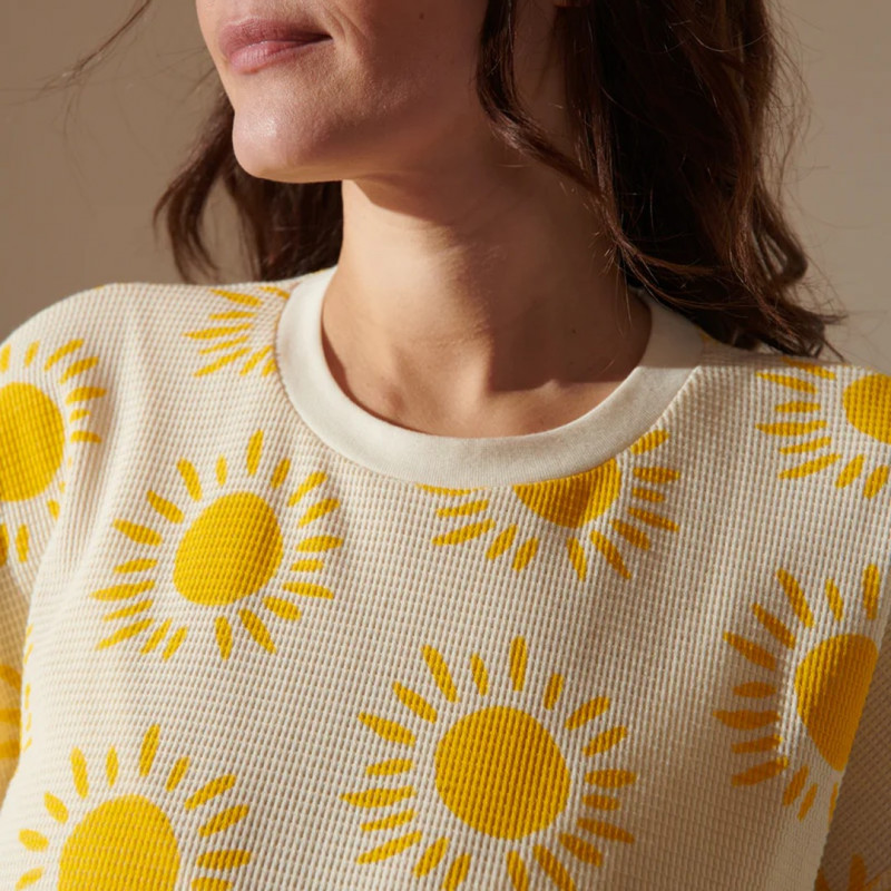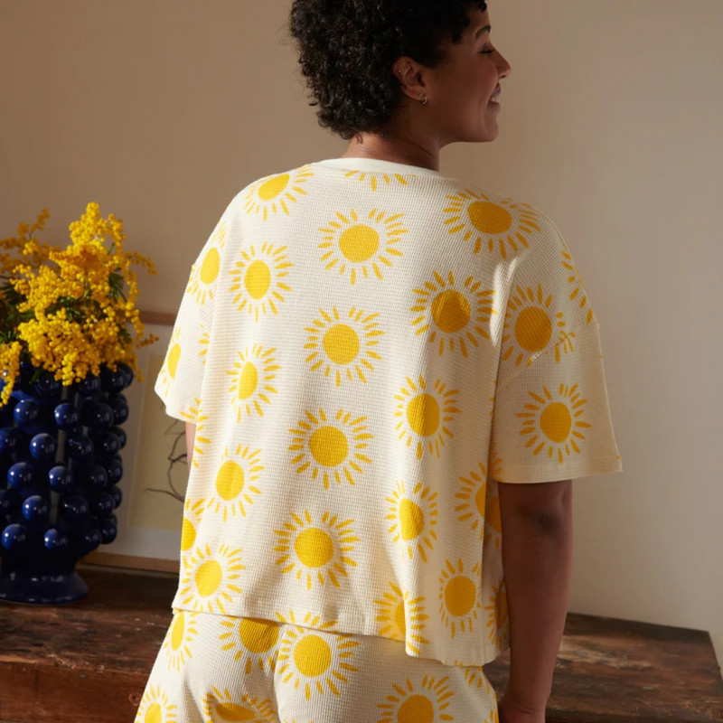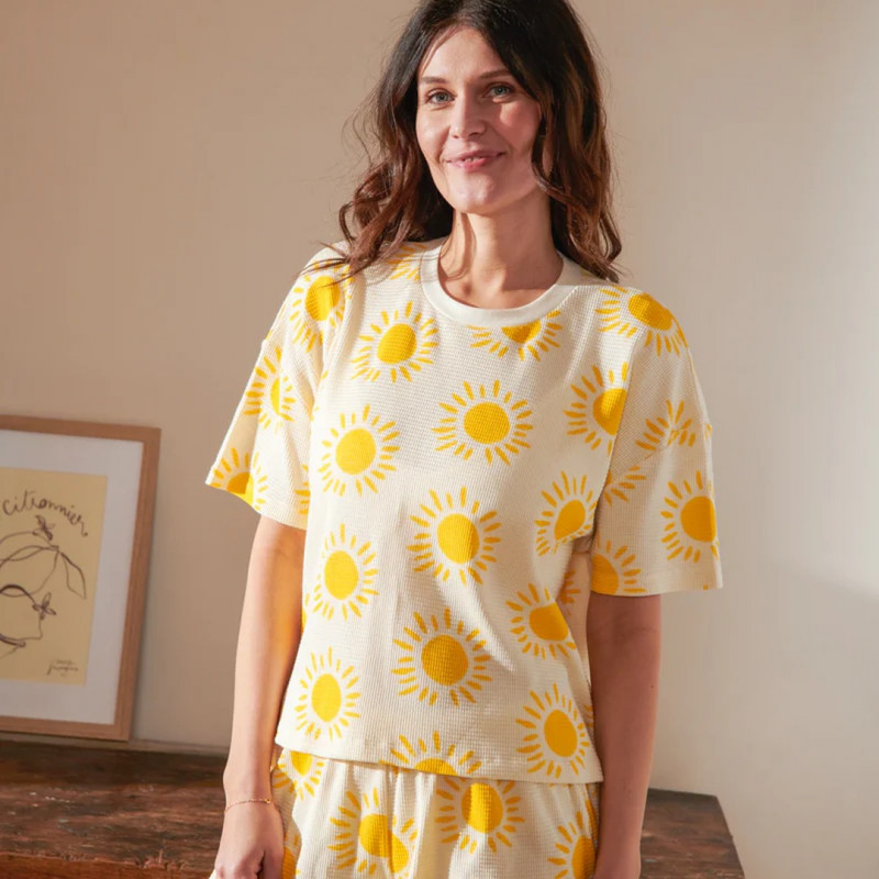 Le pyjama Gaufré Souléu de We Are Jolies se distingue par sa matière texturée : un coton biologique gaufré qui offre un toucher unique, aérien et légèrement structuré. Inspiré par la lumière et la chaleur du Sud de la France, son nom occitan lui confère une identité solaire.