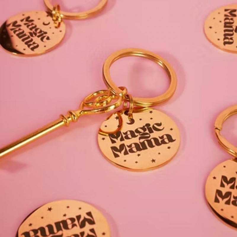 Ce Porte-clé Magic Mama est un petit clin d’œil affectueux. Conçu en acier inoxydable de couleur dorée, un matériau réputé pour sa résistance et sa brillance. Son format de 3 x 3 cm est parfait : facile à trouver dans la poche.