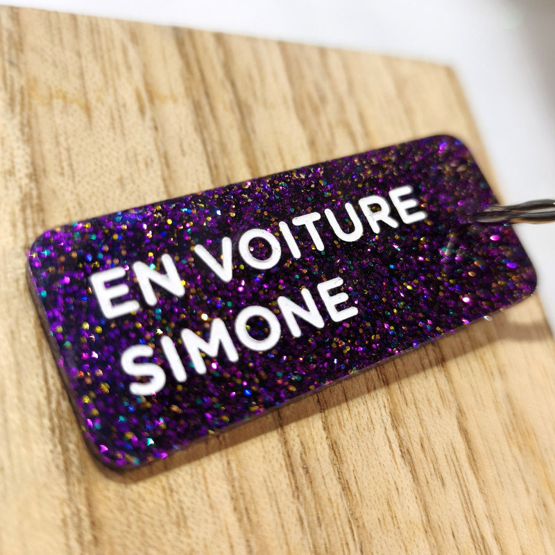 Le porte-clés "En Voiture Simone" sur un fond bordeaux-violet constellé de paillettes multicolores. Fabriqué en France en plexi scintillant, il dépoussière cette expression culte !