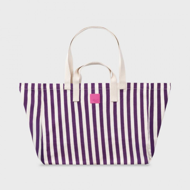 Les rayures violet et écru créent un motif intemporel qui fonctionne aussi bien avec un jean qu'avec une robe d'été ou un tailleur. Les doubles anses permettent de le porter à l'épaule ou à la main.
