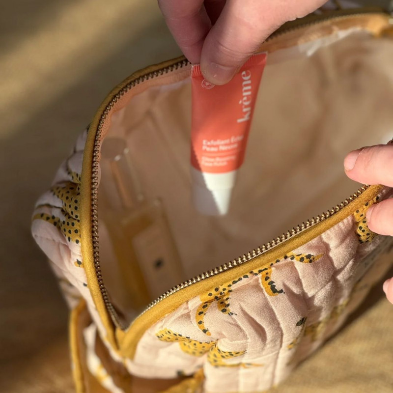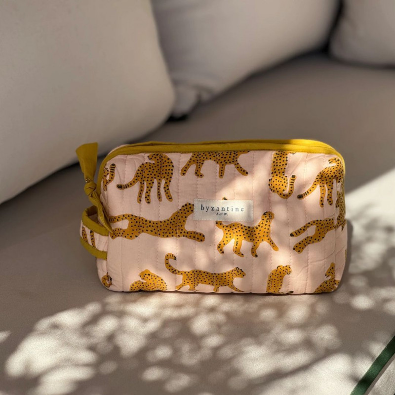 La trousse Fauve Rose by Byzantine : un motif imprimé à la main au tampon de bois (blockprint). Que vous choisissiez la version XL ou petite, ces trousses apportent une touche raffinée à votre routine.