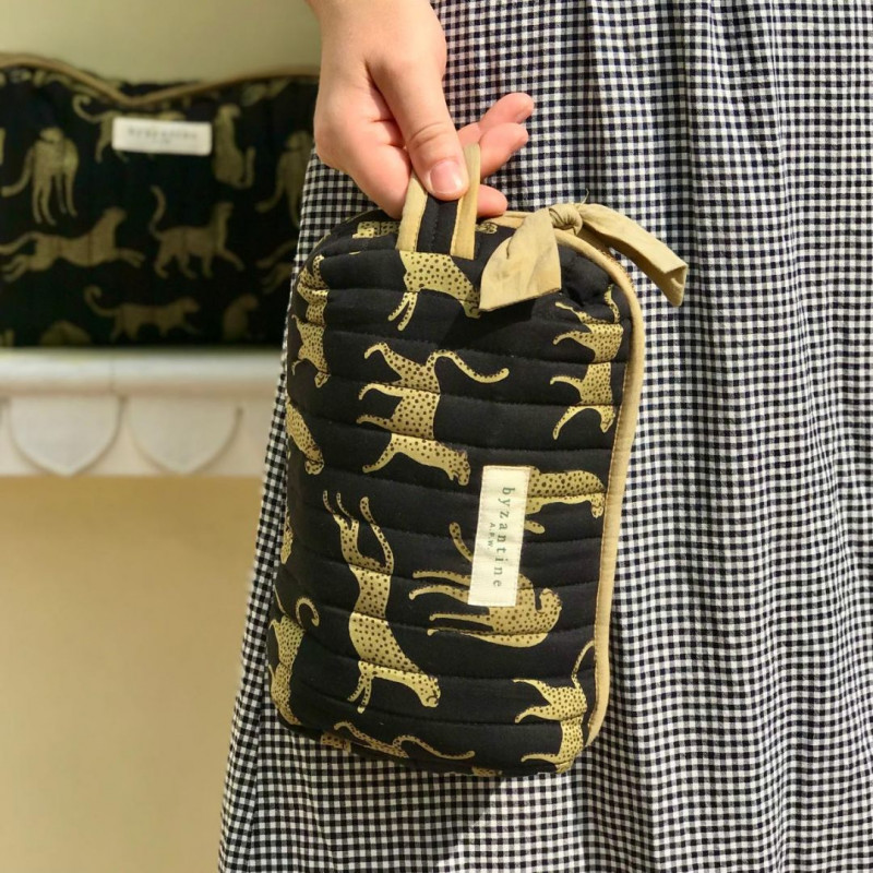 Réalisée à la main en Inde selon la technique du blockprint, cette trousse est imprimée au tampon de bois avec des pigments naturels, ce qui lui confère un rendu artisanal unique et des variations de motif propres à chaque pièce.